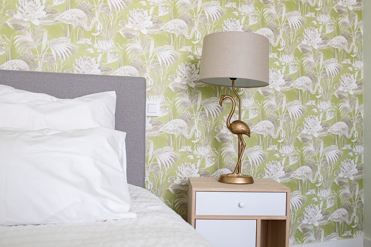 Chambre double de 24 m² climatisée avec une salle d’eau au design et à la décoration épurés, cabine de douche, meuble vasque et wc. L’association du papier peint à motifs, du sol traditionnel et de sa décoration offre à la chambre côté rivière une atmosphère nature.